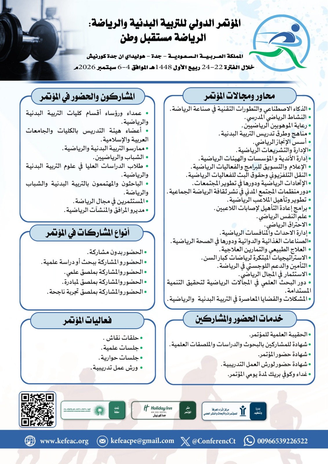 خلال الفترة من 22- 24 ربيع الأول 1448هـ الموافق 04 الى 2026-09-06 | آخر موعد لإستلام المشاركات: 2026-08-04